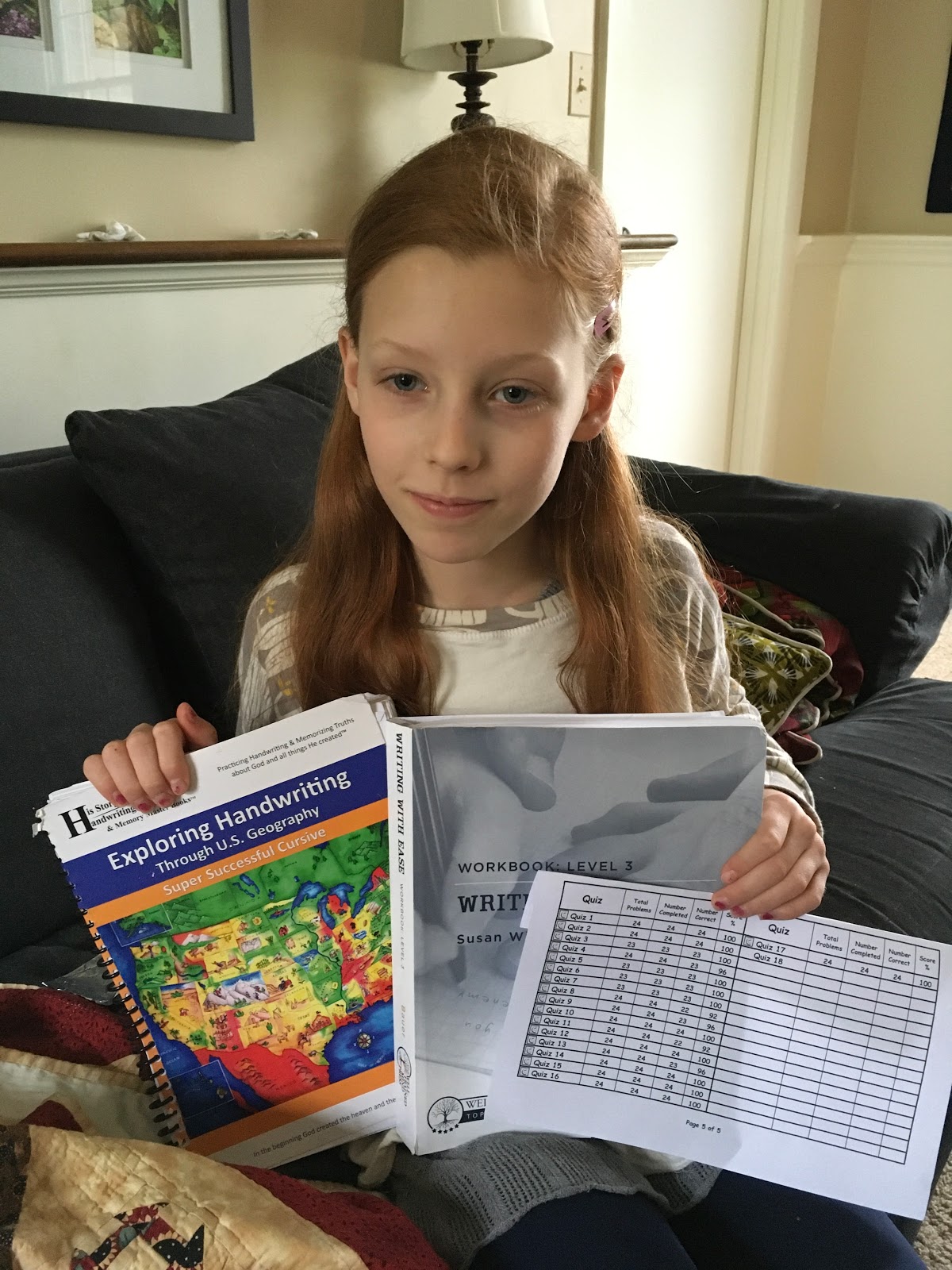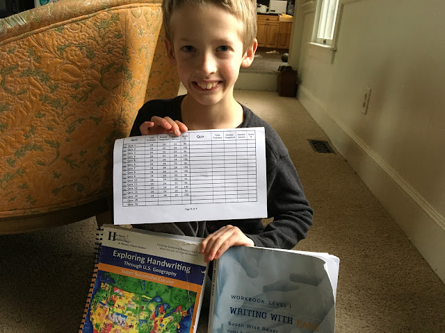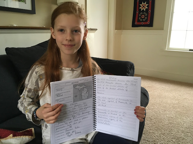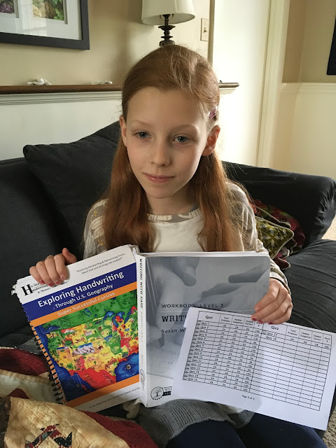 First point I would make from my home school soapbox is -- I like workbooks! I try to limit the kids' screen time/ e-learning to only the most effective platforms, if any. I know workbooks are a lot of paper/trees used etc, but I like being able to follow a course of study all the way through and see progress (based on the date each lesson was completed). It is easier to keep track of and keep organized. The kids like being able to see their progress too AND as a bonus, when they finish one of their school year size workbooks they get to go to a movie with mom or dad.Second point -- I think kids should still learn to write neatly both in printing and cursive script. Big sister A and brother M both worked through these "Exploring Handwriting Through US Geography" cursive books this year. They practiced their cursive while learning about each state. Big sister A is a champ at cursive and has already finished her workbook. Brother M is a little slower and has about 1/3 of his workbook left to do this summer. We are studying US History this year so the US geography dovetails nicely with that.