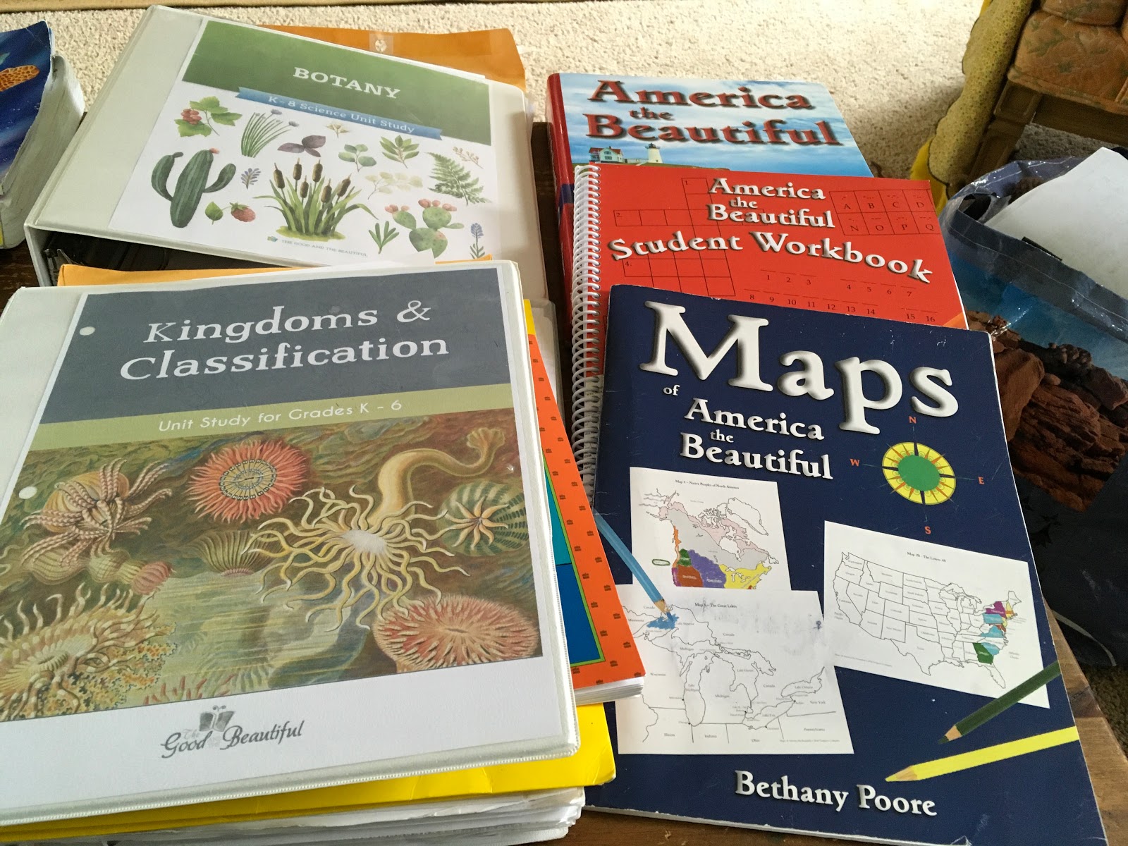 How do I organize our materials? -- one basket by the couch. It does NOT usually look this tidy, but this is where we keep all the day to day books that we are working on. Easy clean-up and easy to find the next day. That pile next to the basket are all the old workbooks and pages that I need to take down to the recycling bin -- glad this post gave me a reason to organize everything again. I try to do that after each semester.
