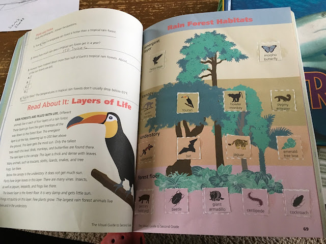 Brother S finished his first big cursive practice book this year and is reading books aloud to me every day. Good thing we have so many books about sharks in the house! We went on a little tangent this week and read a book about Jacques Cousteau and watched some of his early underwater ocean films. Brother S's math workbook (Abeka 2) is about 400 pages long! so he is not finished yet, but at least he likes it. It is probably too much repetition of certain concepts and I have told him that we can skip ahead if he gets bored of doing the same thing again and again. He might do Teaching Textbooks for math in the fall, but has not decided yet which he would prefer.He finished the "Visual Guide to Second Grade" this week, which we really enjoyed working through. We found it at the thrift store and liked it so much that we ordered several more grade levels of it. Brother S is starting the "Visual Guide to Third Grade" this week. These books include a lot of social studies and science. I don't love that they skip around to all different topics, but the hands on, cutting and pasting, graphing and coloring things are right up brother S's alley. For each topic there are a couple of infographics and text about the topic.