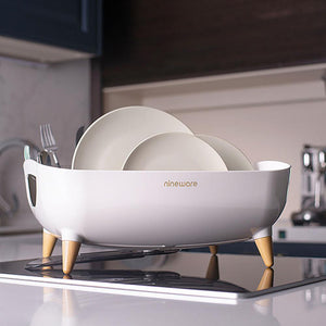 A new and improved version of Nineware Volume Dish Rack, Wide Volume Dish Rack come in a streamlined, contoured body design expressed in high-glossy, robust colors that is modestly exaggerated with wooden feet. This stylish appearance adds to the interior design of your kitchen. The 360° rotatable water drain spout can be adjusted to any direction you wish. The drain is easily detachable for intensive cleaning. The spoon holder is attachable to any part of the dishrack at your convenience. The partitioned structure of each utensil holder helps easy organization of your utensils. As the name suggests, the perimeter walls are of 17 centimeter height, providing tableware racking capacity ideal for family of 4-6. The inner, slotted comparment walls are high enough to prevent plates from tipping. Extra design efforts were made for easy assembly. Just "click" the drain to the center hole and you are good to go. Our environmental concerns make Volume Dishwasher as 100% recyclable (ABS.)
